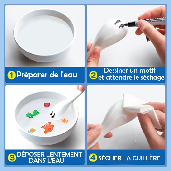 du feutre magique, votre cuillère, votre serviette en papier et de l'eau.