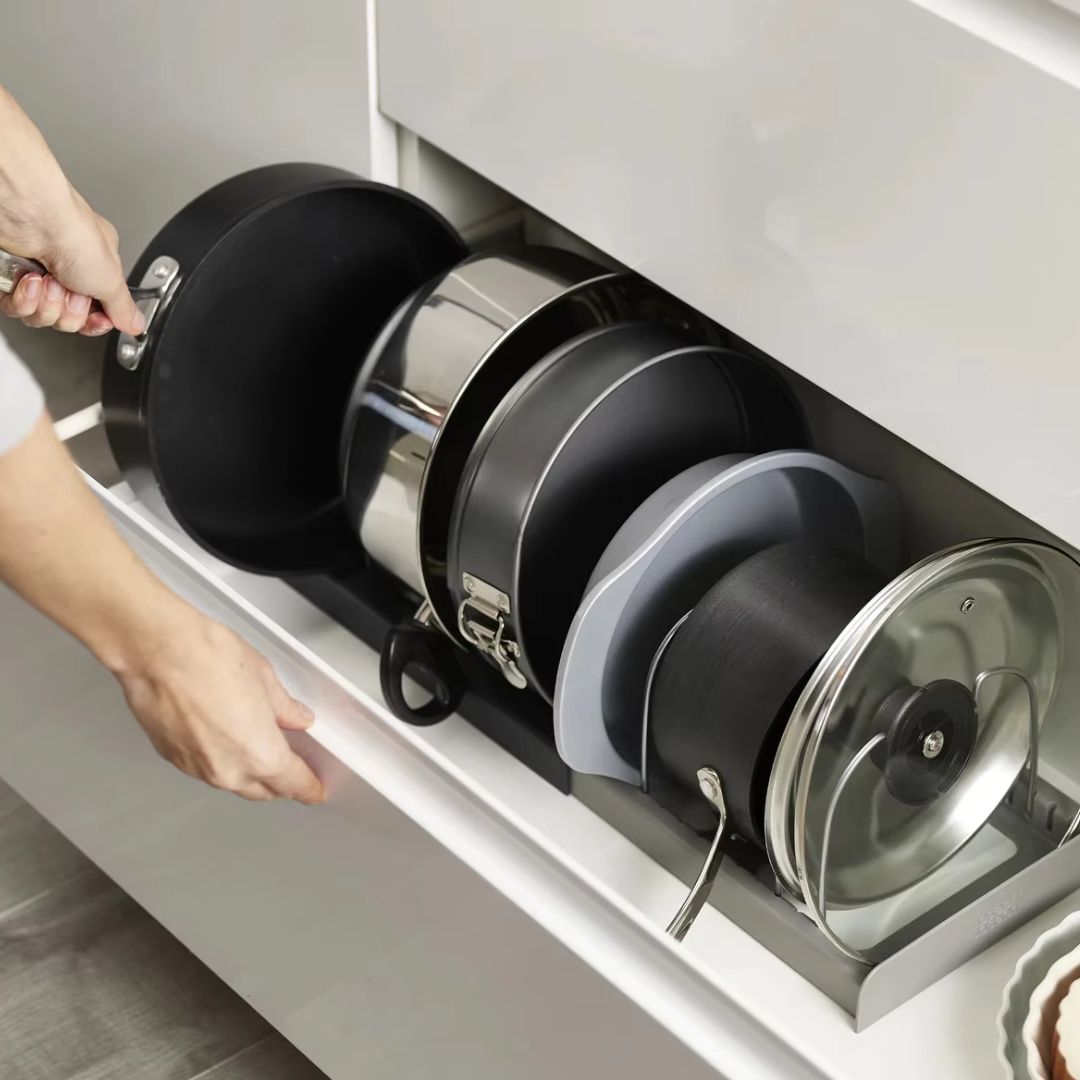 Simplifiez vos tâches de cuisine avec notre Organisateur de couvercles™et transformez votre tiroir de cuisine en un espace de rangement bien organisé.